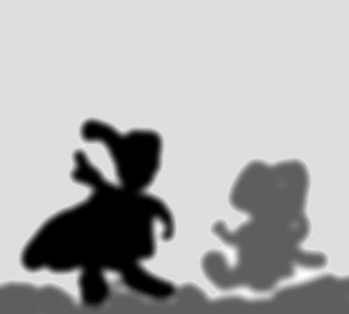 | ぼかしモード1ではZ値画像(被写界深度用マスク)を利用してピンぼけを表現できます。ShadeのStandard以上、その他高機能CGソフトではレンダリング時にZ値画像を出力できるはずなので、それを利用してもOKです。 Z値画像を出力できる環境にない、写真をピンぼけさせたい、などといったときにはZ値画像を作ってみましょう。難しく考えなくても大丈夫です。レイヤーを使えるソフトウエア(GimpやPictbearなど)にて、元画像を下絵に、別レイヤーにて作ります。 例えば、焦点を合わせたい対象は黒く塗りつぶし、ぼかしたい対象を白っぽい色で塗りつぶしていけばよいのです。大雑把に塗りつぶしてもそれっぽくぼかすことが出来るのでお気軽に。 |